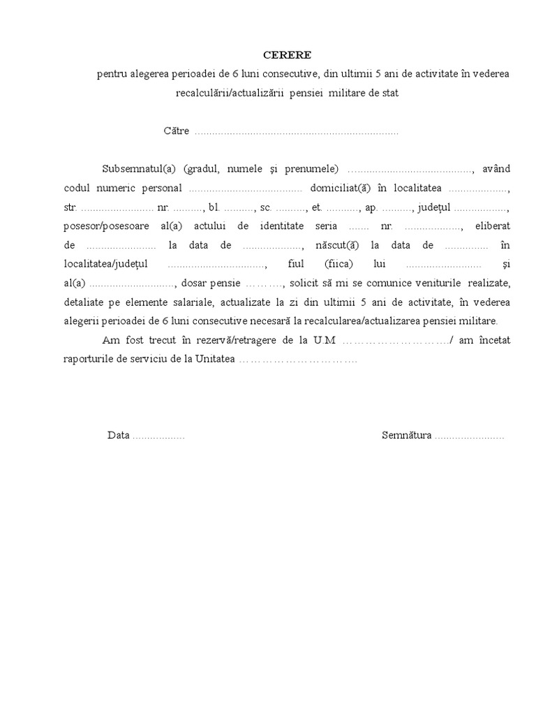 Cerere recalculare actualizare pensie militară publicat pe 8 ianuarie 2016 de administrator. Nimeni nu mi a raspuns la cele scrise de mine am primit in iunie 2017 o decizie cu recalcularea pensiei au injumatatito lund drepturile castigate anul acesta tot in iunie am primit o decizie cu actualizarea pensiei unde s a adagat la functie cei 15 plus 5 a iesit o pensie cu 100 de lai mai mare frumusetea prostiei acum incepe in baza acelorasi legi imi lasa pensia militara avuta in iunie. 10 cerere pentru expertizarea medicală a capacităţii de muncă. Cerere privind eliberarea buletinului de calcul și a celorlalte documente care au stat la baza emiterii deciziei de pensie.