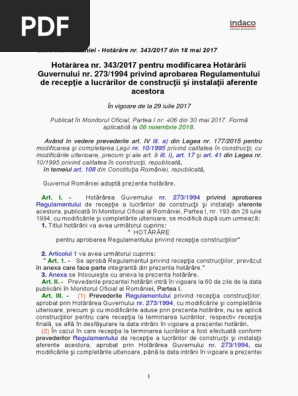 Hotărarea Nr 343 2017 Pentru Modificarea Hotărarii Guvernului Nr 273 1994 Privind Aprobarea Regulamentului De Recepţie A Lucrărilor De Construcţii Si Instalaţii Aferente Acestora